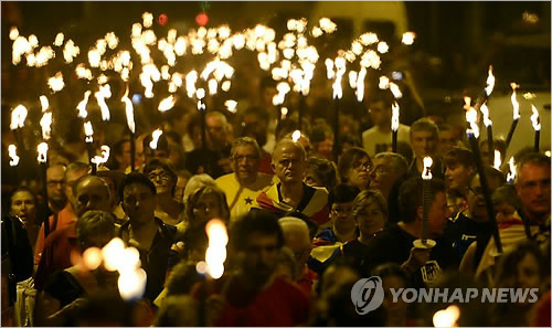 영국의 스코틀랜드 처럼 분리 독립을 요구하는 스페인 카탈루랴 주민들이 10일(현지시간) 바르셀로나에서 횃불을 들고 시위행진을 벌이고 있다. (연합뉴스)