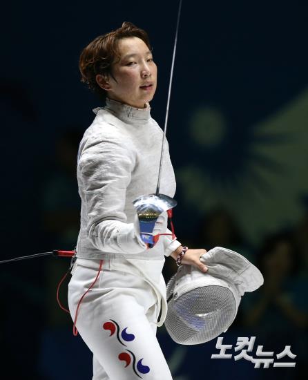이라진이 20일 오후 경기도 고양체육관에서 열린 2014 인천아시안게임 펜싱 사브르 여자 개인 준결승전에서 결승 진출을 확정지은 뒤 기뻐하고 있다.