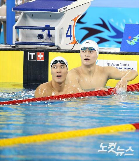 '마린보이' 박태환이 23일 오후 인천 문학박태환수영장에서 열린 수영 자유형 400m 결승 경기를 마친 뒤 쑨양(중국)과 함께 기록을 확인하고 있다 (사진=박종민 기자 esky0830@cbs.co.kr)