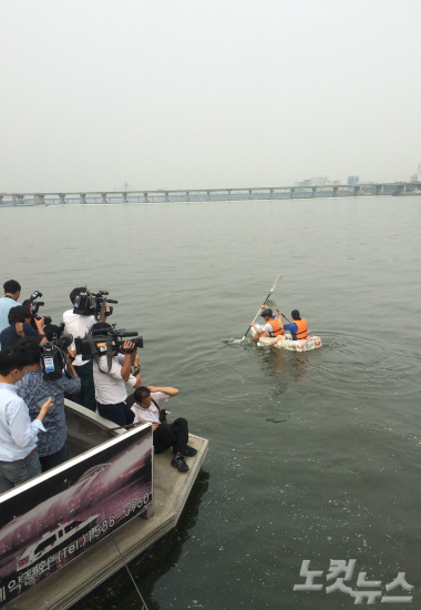 '질소과자' 뗏목 퍼포먼스 벌이는 유성호 씨와 장성택 씨 (사진=최인수 기자)