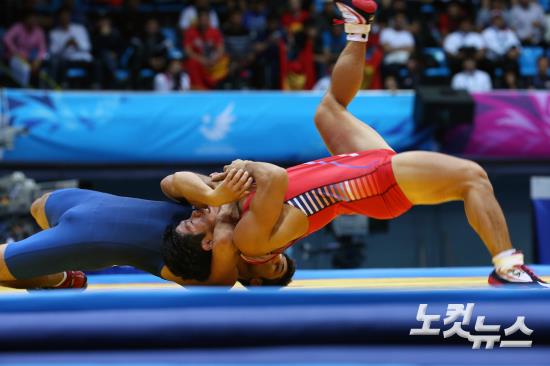 정지현(31.울산남구청)이 30일 오후 인천아시안게임 레슬링 남자 그레코로만형 71kg급 준결승에서 사에이드 압드발리에게 뒤집기 공격을 당하고 있다. 정지현은 사에이드 압드발리를 9-6으로 제압, 짜릿한 역전승으로 결승에 진출했다.