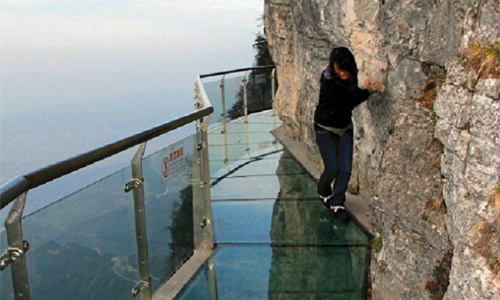 바위 산봉우리 사이를 잇는 이 다리는 길이가 300m에 이른다. 이 다리는 절벽 옆으로 나 있는 길과는 차원이 다르다. 이 유리 구름다리는 바람이 불면 움직이도록 설계돼 있다.