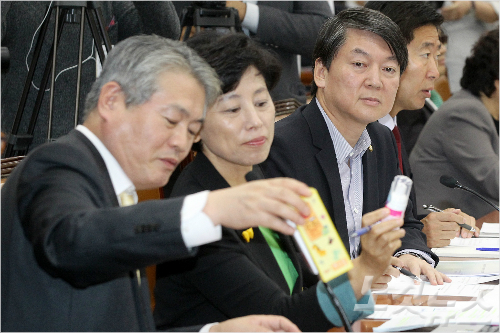 7일 국회 보건복지위원회 국정감사에서 치약 등에 함유된 파라벤과 트리클로산의 위해성 문제와 관련 정승 식품의약품안전처장에게 여야 의원들의 질의가 이어지자 새정치민주연합 안철수 의원들이 동료의원들이 들고나온 치약들을 바라보고 있다. 윤창원기자