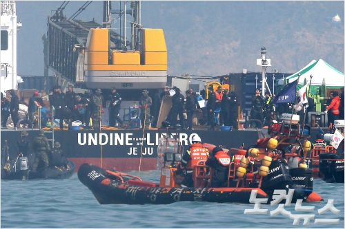 언딘 리베로 바지선과 해양경찰 (사진=윤성호 기자)