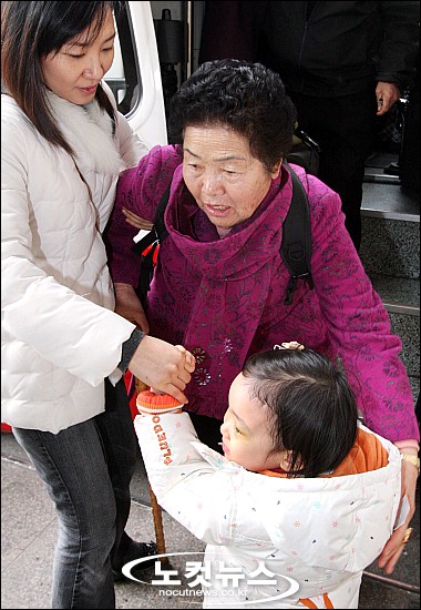 설 연휴 시작을 하루 앞두고 본격적인 귀성이 시작된 5일 오후 강남고속버스 터미널에 역 귀성객이 마중나온 손자와 만나고 있다.