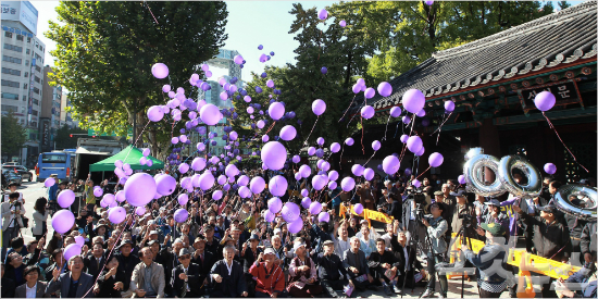 16일 오후 서울 종로 탑골공원 앞에서 열린 민주화실천가족운동협의회(민가협) 1000회 목요집회 참가자들이 양심수 석방과 인권, 민주주의 증진을 촉구하며 보라색 풍선을 하늘로 날려보내고 있다.목요집회는 지난 1993년 9월23일 양심수 석방과 국가보안법(국보법) 폐지를 촉구하며 서울 종로구 탑골공원 앞에서 시작됐다. 황진환기자