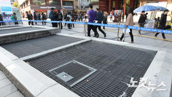 22일 오전 서울 정동 덕수궁 대한문 앞 환풍구에 접근금지 경고문이 붙어있다.