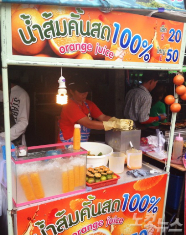 방콕에서 파는 모든 오렌지주스는 100% 과즙으로만 만들어졌다. 직접 눈앞에서 오렌지를 짠 주스를 구입하거나 아이스박스에 나열돼있는 주스를 구입할 수 있다. 주로 팟타이 등의 길거리음식과 먹을 때 같이 마신다.