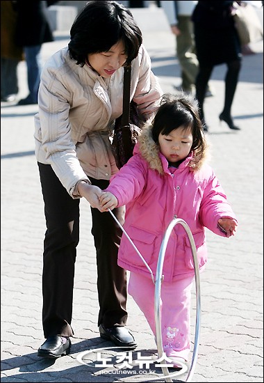 민족 대명절 설 연휴의 첫날인 6일 오후 서울 남산골 한옥마을에서 펼쳐진 ''무자년 설날큰잔치'' 행사에서 한 어린이가 어머니와 함께 굴렁쇠를 굴리며 즐거운 명절 한때를 만끽하고 있다.