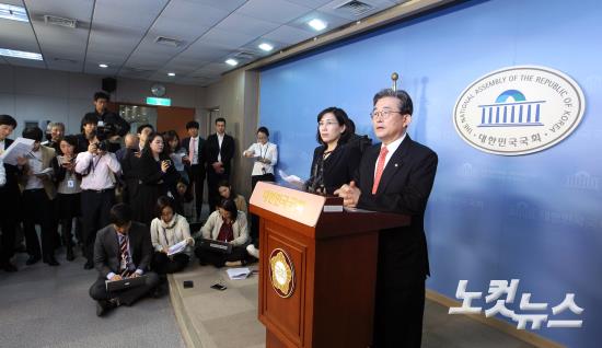 이한구 새누리당 공무원연금 제도개혁 태스크포스(TF) 위원장이 27일 오후 서울 여의도 국회 정론관에서 당에서 마련한 공무원연금개혁안을 발표하고 있다. 새누리당 공무원연금TF는 연금지급 개시연령을 65세로 늦추는 내용의 공무원연금법 개정안을 확정했다.