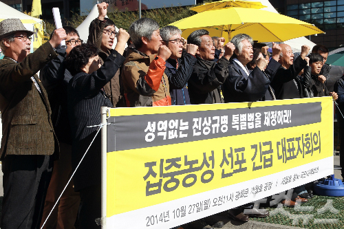 세월호국민대책회의가 27일 오전 서울 광화문광장에서 ‘집중농성 선포 긴급 대표자회의’ 기자회견을 갖고 성역없는 진상규명 세월호 특별법 제정을 촉구하고 있다. 황진환기자