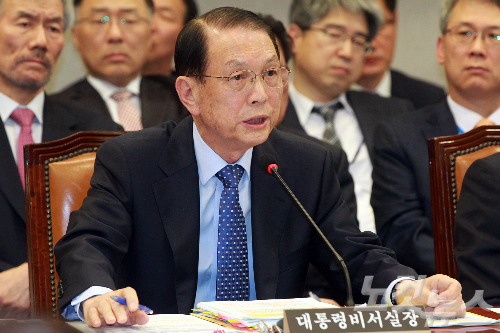 김기춘 대통령 비서실장이 28일 오후 국회 운영위원회 대통령비서실, 국가안보실, 대통령경호실 국정감사에서 의원들의 질의에 답변을 하고 있다. 윤창원기자