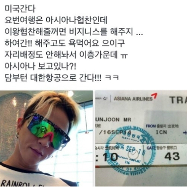 앞서 팝핀현준은 지난달 페이스북에 "미국 간다. 이번 여행은 아시아나 협찬인데 이왕 협찬해 줄거면 비즈니스를 해주지…하여간 해주고도 욕먹어요. 으이구 자리 배정도 안 해놔서 이층 가운데. 아시아나 보고 있나? 다음부터는 대한항공으로 간다"라는 글을 남겼다.