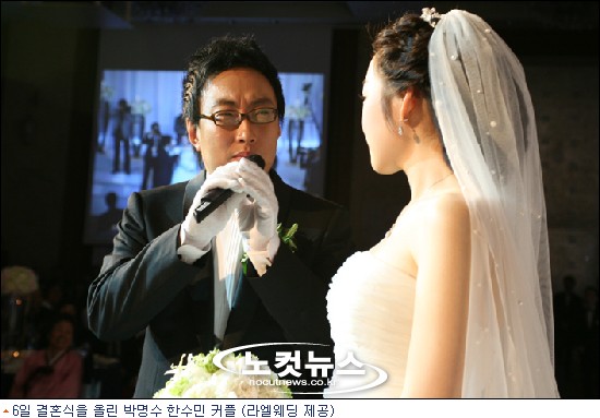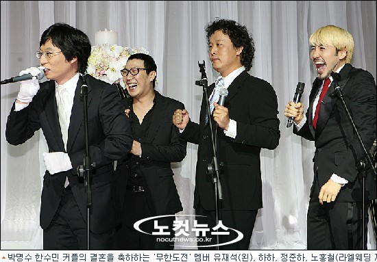 [BestNocut_L]이날 결혼식 주례는 OBS 경인TV 주철환 사장이, 사회는 MC 유재석이 맡았다. 가수 성시경은 이들의 결혼을 노래로 축하했다.