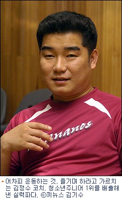 “열심히 했는데 2-0으로 지더라구요. 힘도 빠지고 그래서 그냥 포기했죠. 그런데 이상한 게 마음 비우고 편하게 하니까 잘 되는 거예요. 작은 탁구공이 야구공 만하게 보이고 상대 탁구대가 커 보여 웬만하면 다 들어가더라고요.” 거 참, 마음 비운다고 다 잘되진 않을 텐데, 무슨 비법이라도? 올해 초부터 이들의 탁구 코치를 맡고 있는 김정수(33) 코치는 운이 좋았다며 겸손하게 말한다.