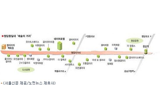 인사동, 삼청동에 흩어져 있던 화랑들이 하나둘 옮겨 가면서 몇년새 청담동은 문화지도를 다시 그렸다. 지난해 말부터 지금까지 아예 메이저급 화랑들을 죄다 껴안다시피 한 대형 갤러리 빌딩이 강남의 새 명소로 떠오르고 있다. 거기서 그치지 않는다. 청담동 문화지도 확장은 여전히 진행 중이다. 청담역 사거리에서 압구정을 아트밸리로 잇는 '예술의 거리' 조성사업도 한창 가속을 붙이고 있다.