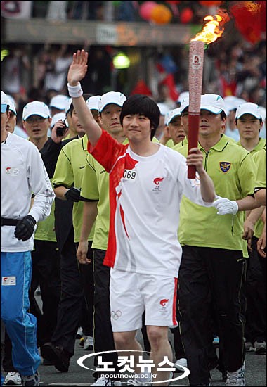 [BestNocut_R]2008 베이징 올림픽 성화 봉송 행렬의 마지막 주자인 1988' 서울올림픽 '굴렁쇠 소년' 윤태웅 씨가 성화를 들고 27일 오후 서울 시청 앞 광장에 마련된 환영행사장에 들어서고 있다.
