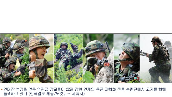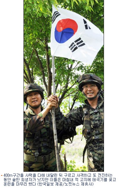 다시 전투훈련체험장. 1조와 2조의 ‘처참한’ 패배를 가까이서 지켜본 3조와 4조가 연이어 고지 탈환에 성공했다. 대항군 진지의 빨간 깃발을 내리고 태극기를 날리는 연대장들의 얼굴에 굵은 땀방울이 줄줄 흘러내린다.