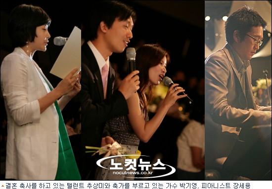 [BestNocut_L]피아니스트 장세용이 신랑 신부 입장과 퇴장 시의 음악 연주 및 축하 연주를 했으며, 가수 박기영이 'You Raise Me Up'를 축가로 불렀다. 또 배우 추상미가 부부의 앞날을 축복하는 기도문을 낭독했다.