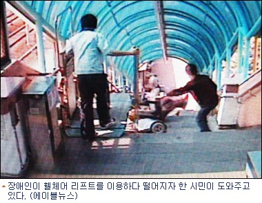 사고 장면이 담긴 CCTV를 살펴보니 휠체어리프트를 이용할 때 옆에서 도와주는 공익요원은 이씨의 목발을 들고 서 있었을 뿐, 전혀 도움이 되지 못한 것으로 확인됐다.