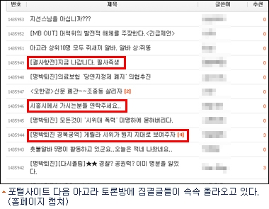 포털사이트 다음 토론방 아고라 등에는 28일 오후 2시에 안국역이나 경복궁역 등 청와대로 가는 길목에서 총집결하자는 글들이 속속 올라오고 있다.