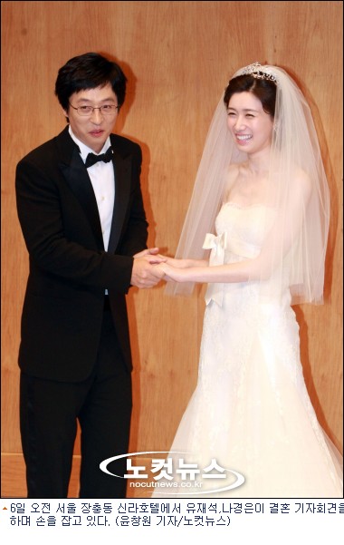 한편 비공개로 치러진 이 날 결혼식에는 MBC 아나운서 출신인 자유선진당 변웅전 의원이 주례를 맡았으며 유재석의 동료인 개그맨 이휘재가 사회를 진행했다. 또 가수 김종국과 개그우먼 송은이가 축가를 불렀으며 박명수 정준하 노홍철 정형돈 등 '무한도전' 멤버를 비롯한 톱스타들이 대거 출동했다.