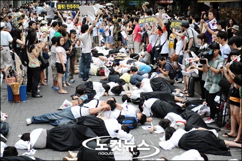 [BestNocut_R]광복 63주년, 정부수립 60주년을 맞은 15일 오후 서울 인사동 일대에서 '소울드레서', '디브이디 프라임'을 비롯한 인터넷 카페 회원들이 모여 '민주주의는 죽었다', '깨어나라 대한민국'을 주제로 플래시몹 퍼포먼스를 하고 있다.