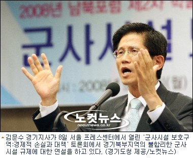 한편 김 지사는 이 자리에서 군사시설보호법이 시행된 1972년 12월 이후 2007년까지 34년간 경기도가 총 1천178조원의 소득손실을 입었다는 경기개발연구원의 연구 보고서를 언급하면서 "이 돈을 내놓으라는 게 아니라 좀 알아달라는 것"이라고 강조하기도 했다.