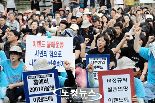 지난해 비정규직법 시행을 앞두고 홈에버 매장의 계약직 직원들을 계약해지, 외주화에 반발해 농성에 돌입한 이랜드 노조는 ‘전직원 고용승계’와 ‘해고자복직’을 보장을 주장하며 추석을 앞두고 전국 홈에버 매장 앞에서 집중투쟁을 벌이고 있다.