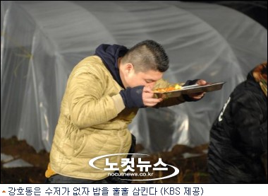PM 6:00 추위 때문에 2-3시간은 지났을 것 같은데 고작 1시간밖에 지나지 않았단다. 그 새 비닐하우스는 제법 집다운 모양새를 갖췄다. 다른 연기자들은 구슬땀을 흘리며 집을 짓는데 약삭빠른 MC몽은 기자들이 모여 있는 곳으로 몸을 피했다. 그가 꺼져가는 불씨를 살리자 이명한 PD는 내기를 제안했다. “네가 내 이마에 땀을 흘리게 하면 군고구마 2개를 주마” 갑자기 승부욕에 불탄 MC몽이 열의를 보이기 시작했다. 땔감이 될 만한 것들을 주워오더니 불씨를 향해 마구 부채질이다. 그의 노력에 불길이 훨훨 타오르자 “나 오리지널 강남 출신이야”라고 어깨를 으쓱해 보인다. 하지만 불 붙이는게 쉬운 일은 아니다. 잘 타는가 싶더니 이내 불길이 죽어버렸다. 당황한 MC몽, 그는 과연 고구마를 얻을 수 있었을까.