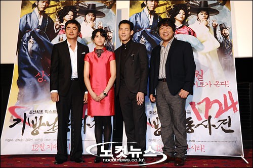 [BestNocut_R]배우 김석훈, 김옥빈, 이정재, 이원종이 6일 오전 서울 용산 CGV에서 열린 영화 '1724 기방난동사건' 제작보고회를 마치고 포토타임을 갖고 있다.