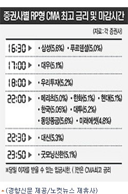 [BestNocut_L]대우증권은 오후 5시가 마감시간이다. 삼성증권 CMA는 마감시간이 가장 이르다. 오후 4시30분까지 돈을 넣어야 다음날 하루치 이자가 나온다. 이에 따라 삼성증권은 다음달부터 마감시간을 늦추는 방안을 검토 중이다.