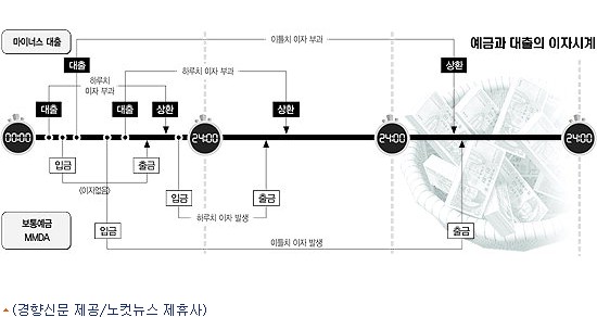 ◇ 예금과 대출도 ''이자시계'' 달라 은행들이 예금과 대출 이자를 산정할 때 적용하는 ''하루''의 기준도 다르다. 보통예금이나 수시입출금식예금(MMDA)은 자정을 기준으로 예금이자를 지급한다. 보통예금은 이자가 연 0.1~0.3% 수준으로 사실상 거의 없는 것이나 마찬가지이고, MMDA도 예치금이 1억원 이상일 때 연 2%가량의 이자를 지급하기 때문에 낮은 편이다.