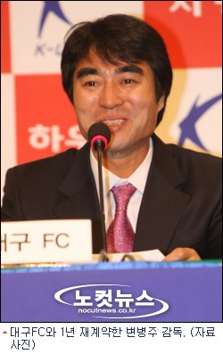프로축구 대구는 30일 보도자료를 통해 "변병주과 1년 재계약에 합의했다"고 밝혔다. 변 감독은 당초 계약기간을 놓고 구단과 이견을 보였지만 결국 1년, 1억8,000만원에 계약했다.