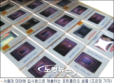 ◈한 장에 60만 원, 최고 천만 원 ‘포트폴리오’란 학생들이 그린 그림을 슬라이드 형태로 모은 그림 모음집으로, 서울대 미대 입시에서 25%의 비중을 차지하는 면접 및 구술전형의 필수 제출 자료이다. 2009학년도 서양화과 정시 모집에서도 오는 12일에 수험생 한 사람당 15장의 포트폴리오를 접수하고 있다.