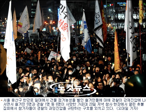 여섯 명의 목숨을 앗아간 서울 용산 4구역 재개발 지역 참사 현장에서는 20일 오후 7시부터 시민 수천여명 이상이 모인 가운데 철거민 추모 촛불문화제가 열렸다.