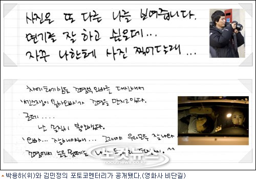 김민정의 포토코멘터리는 유난히 잘 통했던 감독님에 대한 글이 인상적이다. 또 조명팀을 대신해 조명을 세팅하는 박용하의 사진에는 "센스쟁이 용하 오빠가 조명을 만지고 있다. 근데 난 솔직히 불안했다. 오빠, 잘해야해. 그래야 우리 모두 잘나와"라고 적는 등 애교 넘치는 모습을 엿볼 수 있다.