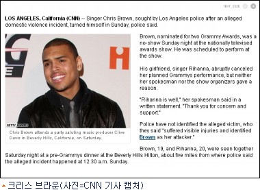 그래미 시상식 날 크리스 브라운(19)이 폭행 혐의로 체포된 사실이 알려진 가운데 브라운이 폭행한 여성이 그의 여자친구인 리한나(Robyn Rihanna Fenty)라는 사실을 경찰이 밝혔다고 AP, LA 타임스 등 외신들이 보도했다.
