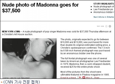 지난 12일(현지시각) 오후 마돈나의 30년 전 누드 사진이 경매에 올라 3만7천500달러(약 5천2백만원)에 낙찰됐다고 CNN 등 외신들이 전했다.