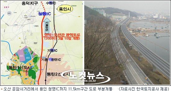 광역교통개선대책에 따라 한국토지공사가 시행하는 영덕~오산 간 광역도로 사업 구간 중 오산시 운암사거리에서 용인시 기흥구하갈동 청명 IC까지 연장 11.5km의 일부 구간이 10일 개통됐다.
