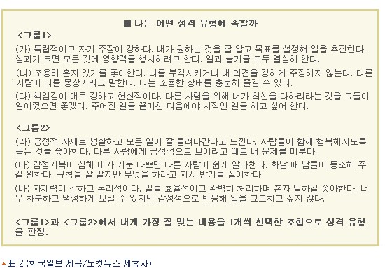 가령 성격 유형이 6번인 사람은 자기 고유의 성격과 함께 인근 번호(5번이나 7번)의 성격을 부수적으로 갖는다(<그림>, <표 2> 참조). 6번은 화살표가 오는 유형(9번)의 장점을 보완하면 자기발전에 도움이 된다.