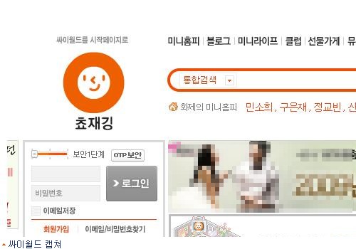 1일 커뮤니티 사이트 싸이월드는 초기화면 로고를 'CYWORLD' 대신 쵸재깅'이라는 단어를 새겨넣었다. 쵸재깅은 한영 변환키를 누르지 않은 채 CYWORLD를 입력했을 때 나오는 한글 단어다. [BestNocut_R]