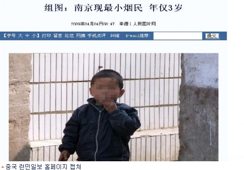 온바오닷컴은 5일 중국 런민(人民)일보 인터넷판 인용 보도를 통해 중국에서 2-3살 정도로 추정되는 남자 아이가 능숙한 솜씨로 담배를 피우는 모습을 게재해 파문을 일으키고 있다고 보도했다.