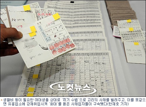 최근에 대부업자의 독촉에 시달리다 못해 시민단체에 도움을 요청한 김모(경기도 구리시) 씨의 경우에도 얼마 전 급전이 필요해 10만 원씩 60일간 총 600만 원을 갚는 조건으로 5백만 원(연이율 302%)을 대출받았다.