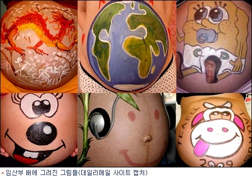 이뿐 아니라 많은 임산부들이 자신의 임신한 배에 꽃무늬 색종이를 붙이기도 하고 어항이나 소, 심지어 ‘스펀지송’ 등 만화 캐릭터까지 그려넣기도 했다