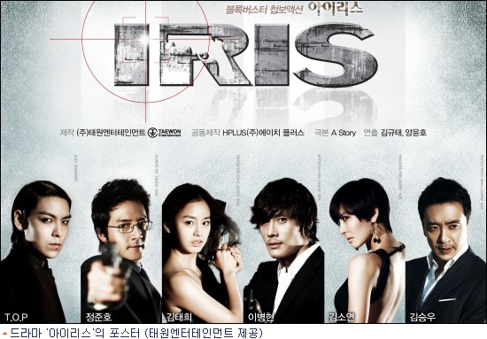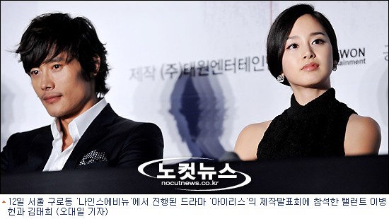12일 오후 서울 구로동 나인스 에비뉴에서 진행된 아이리스 제작발표회에서 주연배우 이병헌, 김태희, 정준호, 김승우, ‘빅뱅’의 탑(최승현) 등은 밝은 얼굴로 “혹시 벌어질지 모르는 2차 한국전쟁을 막고자 임무를 수행해 나가는 특수한 사람들의 이야기를 전개하려 한다”며 드라마를 소개했다.