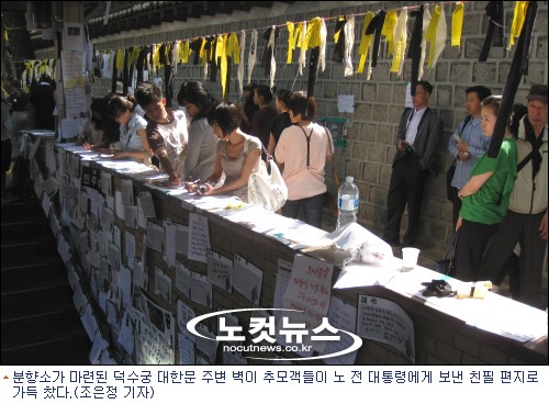 서울 덕수궁 대한문 시민 분향소 주변에는 노 전 대통령에게 보내는 '추모 편지'들로 일대 벽이 빼곡하게 채워졌다. 지나가던 시민들도 발길을 멈추고 벽에 붙은 편지 내용을 읽어보면서 눈물을 훔치기도 했다.