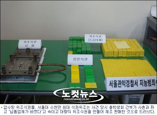 서울 관악경찰서는 학생식당 식권을 위조해 팔아넘겨 5천여만 원을 챙긴 혐의로 52대 총학생회 간부 최모(27) 씨에 대해 구속영장을 신청하고 최 씨의 사촌인 정모(33) 씨를 불구속 입건했다.[BestNocut_R]