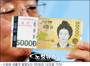 5만원짜리 신규화폐가 23일 첫선을 보이지만 활발하게 유통되기까지는 다소 시간이 걸릴 것으로 보인다. 경기침체로 수익을 내지 못하는 은행들이 한꺼번에 현금자동입출금기기(ATM)를 교체하기가 쉽지 않기 때문이다.