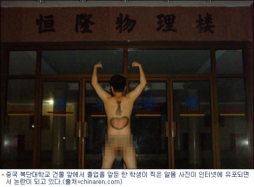 중국 인터넷 사이트 chinaren.com에는 최근 중국의 명문대인 복단대학교(復旦大學)의 학생으로 보이는 젊은이 2명이 알몸으로 찍은 사진이 올라왔다.